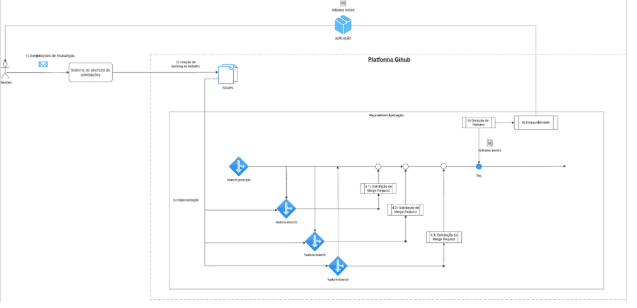Implementation: for each issue, a feature branch is created—an isolated version of the application that will receive the new functionalities. These branches are short-lived, existing only during implementation and validation.