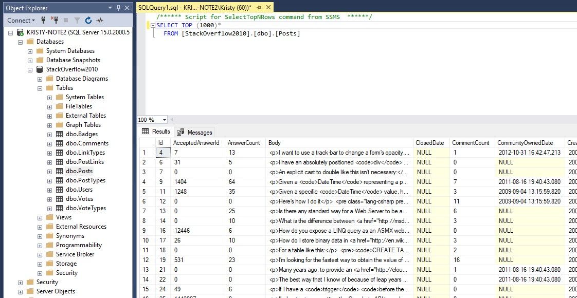 The database to be used for this lab it’s the open source data export from Stack Overflow (2010 version) in a 2019 SQL Server instance (developer edition).