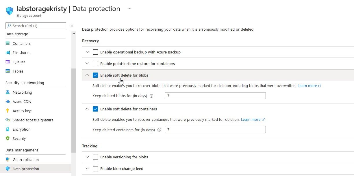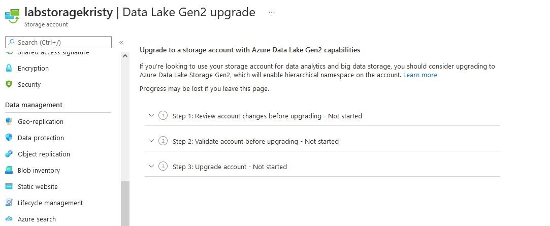 Also, we need to enable Data Lake Gen2, but first let’s disable ENABLE SOFT DELETE FOR BLOBS, without disabling it we’ll receive an error when upgrading to Gen2