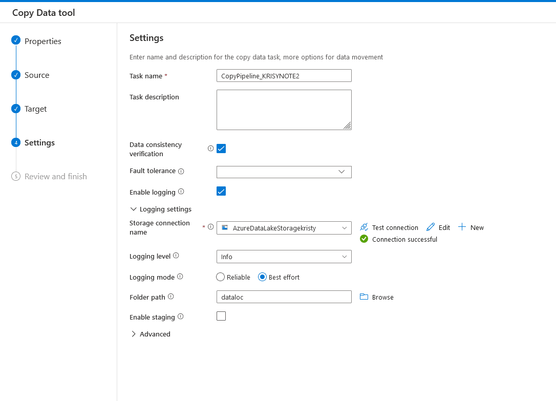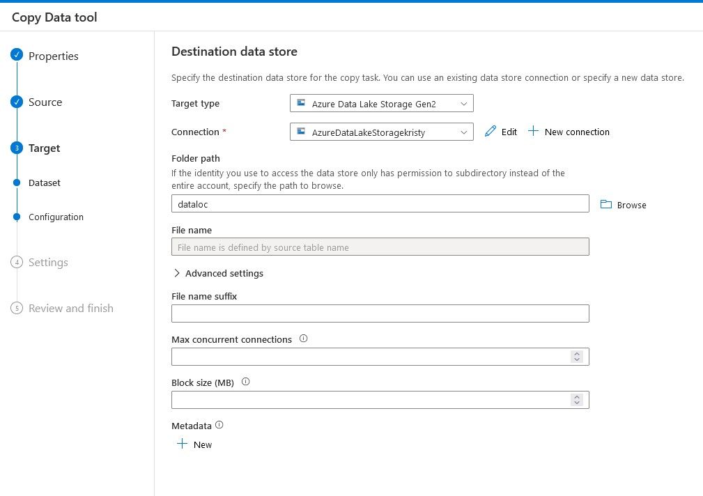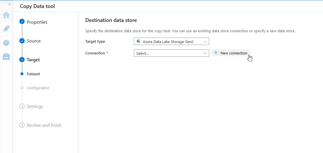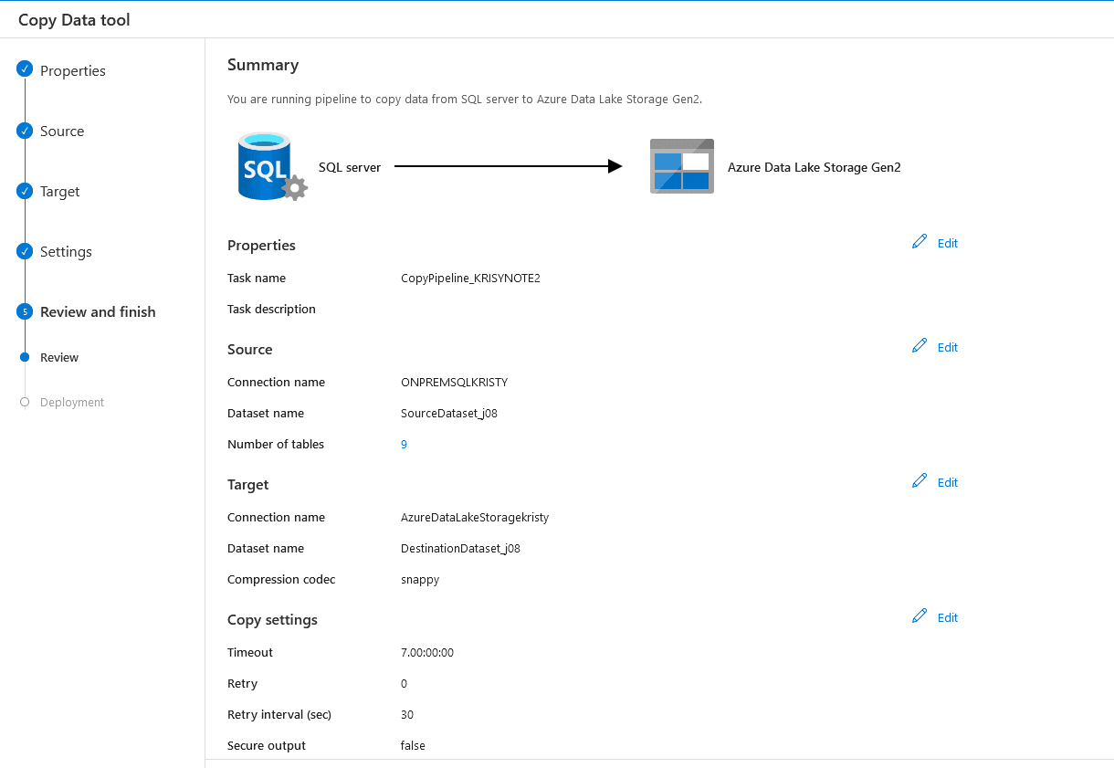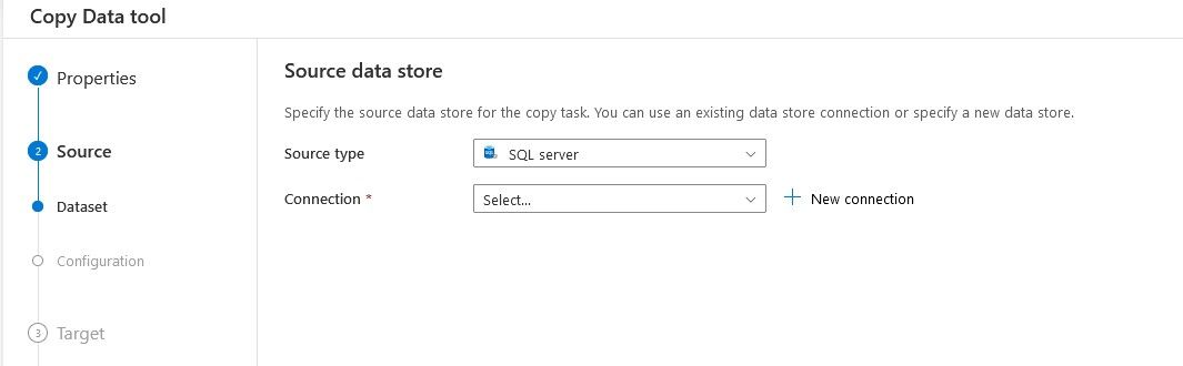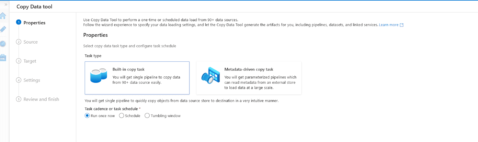 It’ll open the copy data tool, for now we’ll use the “Built-in copy task” with “Run once now” to run a single load.