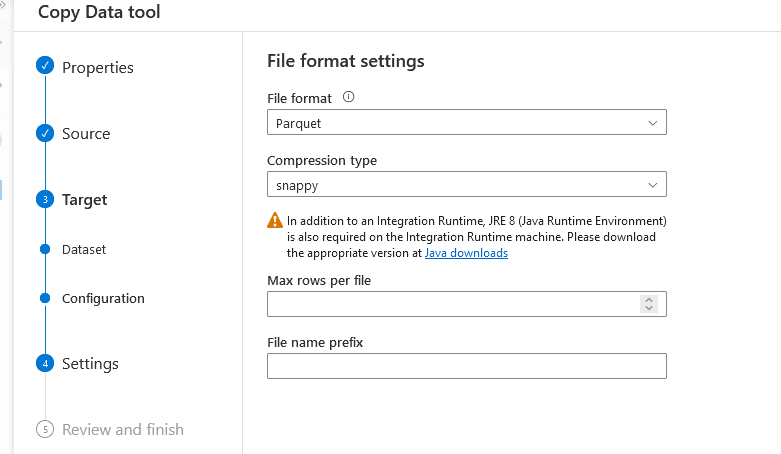 We have some options to choose, I’ll use Parquet format and snappy compression.