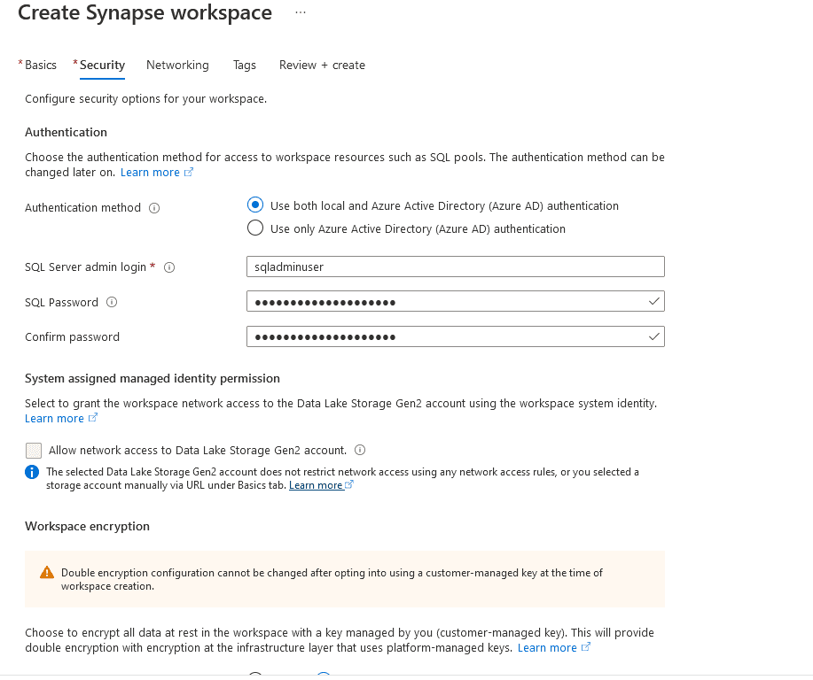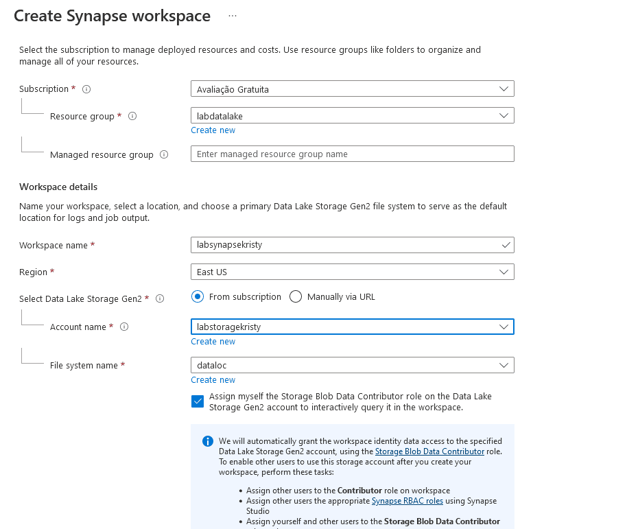 Now let’s create the Synapse Workspace linking the storage account and the container that will be used: