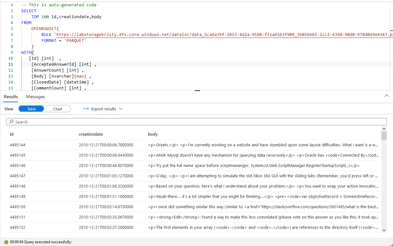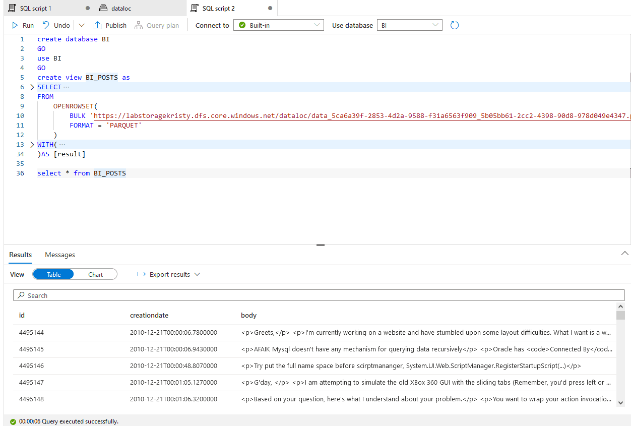 Now the best part, we can also create a database and load our parquet files, I created a database named BI and a view named BI_POSTS containing the parquet file from the Posts table: