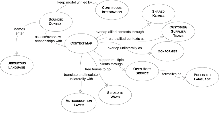 Several patterns describe the relationships between bounded contexts and their models. Which one to use depends heavily on the situation and the needs present. Here is a list of some of the most relevant among these patterns: